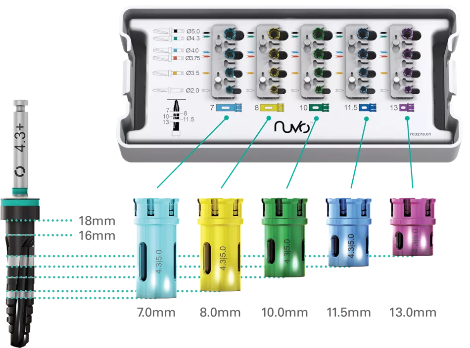 Facilitând identificarea secvenței de frezare, diametrul și lungimea implantului, combinate cu un mecanism simplu „pick and drop”, soluția de stopper freză NUVO™ este proiectată pentru a asigura precizia adâncimii de frezare în procedurile chirurgicale, cu posibilitatea utilizărilor multiple.